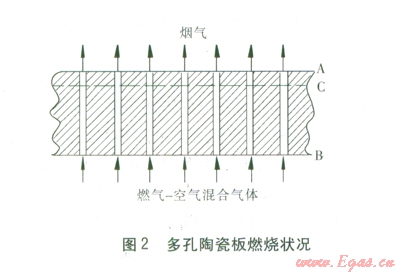 多孔陶瓷板燃燒狀況見圖2[1-2]。陶瓷板紅外輻射式燃燒器的輻射面是布滿許多小孔道的陶瓷板,當燃氣-空氣混合氣體通過小孔道著火后,燃燒所產生的熱量主要加熱煙氣和陶瓷板,其中陶瓷板得到的熱量大部分由A面向外輻射。當?shù)蜏氐娜細?span lang="EN-US">-空氣混合氣體從B面流進孔道以后,對孔道壁進行沖刷冷卻,同時其本身沿孔道長度方向溫度逐漸升高,當接近A面時,又得到來自火焰面的輻射熱,使其立即達到著火溫度而燃燒。隨著陶瓷板外表面溫度的升高,其沿A—B各點溫度也相應升高,使小孔道內的未燃混合氣體預熱溫度也相應升高,加劇了燃燒反應,提高了燃燒溫度和火焰?zhèn)鞑ニ俣?,火焰面?span lang="EN-US">A面向板內移動,同時燃燒溫度升高,增加了陶瓷板內各點溫度,使其既向外增加輻射熱,又提高了小孔道內未燃混合氣體的預熱溫度。當燃燒反應熱等于散熱而達到熱平衡后,燃氣-空氣混合氣體的預熱溫度不再升高并有可能在離A面某一距離的C而就達到著火溫度。氣流速度和火焰?zhèn)鞑ニ俣冗_到一定的動平衡,火焰面就穩(wěn)定在C而上。如果增加負荷即增加燃燒反應熱,而陶瓷板的散熱速度小于反應熱的生成速度,則火焰面向B面移動,此時,靠近陶瓷板內表面B面處的燃氣-空氣混合氣體預熱溫度升高很快,當達到著火溫度時,火焰面就立即移至外殼內形成回火,稱為熱回火,即負荷過大使相應的火孔熱強度大而產生熱回火。