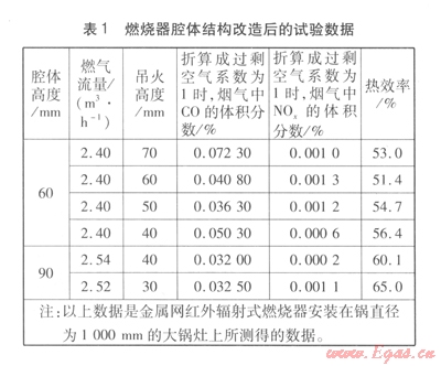 采用新型結構燃燒器腔體后,腔體的體積變小,同時改變了噪聲耦合頻率,高頻噪聲消失。但腔體內部高度要適宜,過小易造成燃氣、空氣混合不均,燃燒不完全而使C0含量升高。燃燒器腔體結構改造后試驗數(shù)據(jù)見表l。