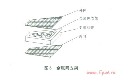 火蓋不嚴,漏火點過大,以及金屬網變形后孔徑變大,超過了同火極限孔徑,由于火孔熱強度相對于一般大氣式燃燒器要低,如果火孔之外再有不嚴密的地方,就會造成出火面積過大,火孔熱強度過低,造成回火。還有結構方面的原因,金屬網紅外輻射式燃燒器火焰在上下兩層網之間燃燒,網間距為1012 mm,由于火焰的溫度較高,金屬網表面的溫度達到l 000℃左右,使得外網容易發(fā)生變形,變形嚴重時,上下網之間的間距縮小,局部有些地方距離過小甚至貼上,就會使火焰在內網上燃燒,從而發(fā)生回火現(xiàn)象。在兩層網之間加設支架能減小變形,控制上下網之間的間距,達到避免回火的目的。金屬網支架見圖3