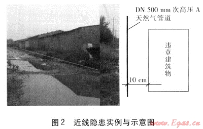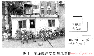 根據(jù)占壓形式的不同,管道占壓隱患又可以分為壓線隱患和近線隱患2類。壓線隱患是指建、構筑物直接占壓在管道上方,占壓物邊界的投影在管道上方的隱患。近線隱患是指建、構筑物邊界的投影在管道一側(cè),但管道與占壓物的水平凈距或垂直凈距不能滿足規(guī)范中的相關要求的隱患。壓線隱患、近線隱患實例見圖1、2。目前統(tǒng)計的695處管道占壓隱患中,壓線隱患有623處,占全部隱患的89.64%,近線隱患72處,占全部隱患的10.36%。