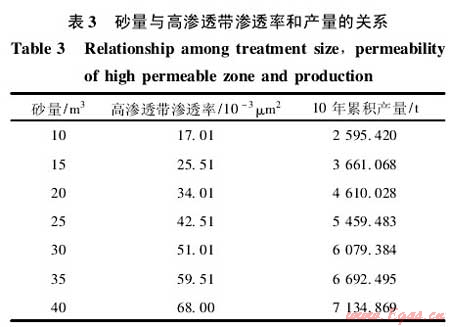 從表3知,隨著加砂規(guī)模的增大,高滲透帶的滲透率和壓裂后的產量逐漸增大,當單簇高滲透帶加砂規(guī)模大于25m3時,累積產量增加趨勢減緩。由圖7和圖8數(shù)值模擬結果知本井優(yōu)化的高滲透帶滲透率上限為40×10-3μm2,對應的砂量為20~25m3。綜合考慮施工風險,建議本井高滲透帶滲透率取30×10-3μm2左右,每簇高滲透帶的砂量為15~20m3。