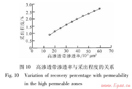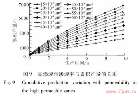 在建立的數(shù)值模型中嵌入高滲透帶,改變高滲透帶的特征參數(shù),通過數(shù)值模擬分析高滲透帶對累積產量和采出程度的影響。