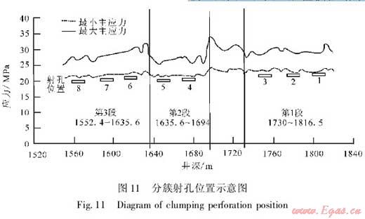 本井優(yōu)化的高滲透帶數(shù)量為8簇,因此,射孔簇數(shù)為8簇。綜合選擇GR(自然伽馬)低、脆性礦物含量高、應力值相對較低的層段進行射孔,以有利于裂縫延伸起裂,形成縫網(圖11)。根據(jù)應力測試,QY2井最小主應力在22.1~32.4MPa之間,因此,支撐劑應滿足35MPa閉合壓力要求。
