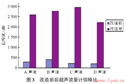 (3)由于在超聲流量計(jì)與調(diào)壓閥之間安裝了T形管件和90°彎頭,且工藝管道埋地后相當(dāng)于增大了流量計(jì)與調(diào)壓閥之間的管道距離,干擾噪音明顯降低,超聲流量計(jì)運(yùn)行狀況正常、穩(wěn)定。利用Daniel CUI軟件對(duì)超聲流量計(jì)進(jìn)行現(xiàn)場(chǎng)診斷后發(fā)現(xiàn):超聲換能器信號(hào)質(zhì)量均為100%,信噪比SNRs均超過(guò)2000(圖3)。