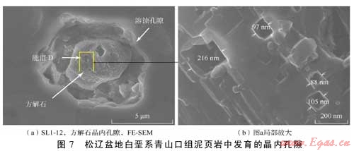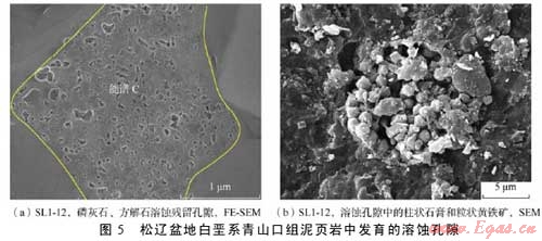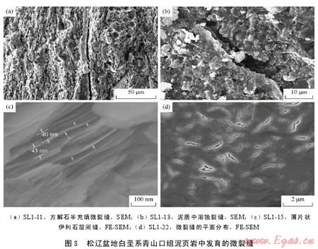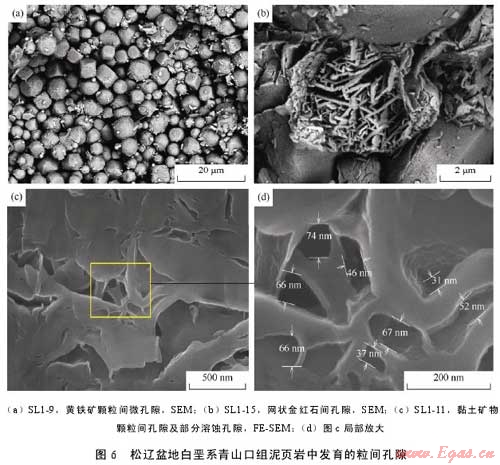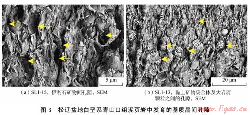 摘 要:為了查明泥頁巖系統(tǒng)微觀孔隙發(fā)育特征及其油氣地質(zhì)意義,利用掃描電鏡及場發(fā)射掃描電鏡二次電子成像技術(shù)對松遼盆地白堊系青山口組一段泥頁巖中的微觀孔隙進行了系統(tǒng)觀察。該套泥頁巖中主要發(fā)育了5種類型孔隙,即基質(zhì)晶間孔、有機質(zhì)孔、溶蝕孔、粒間孔、晶內(nèi)孔;此外,還發(fā)育大量微米—亞微米級(納米級)微裂縫,包括溶蝕縫、充填縫及層間縫3類。微孔隙和微裂縫構(gòu)成復(fù)雜微裂縫網(wǎng)絡(luò)-孔隙系統(tǒng),為烴源巖生成的油氣向外排驅(qū)提供了有效通道,同時也為殘留在頁巖中的油氣提供了充分的儲集空間,對于油氣的初次運移以及頁巖油氣等非常規(guī)資源的儲集具有重要意義。
