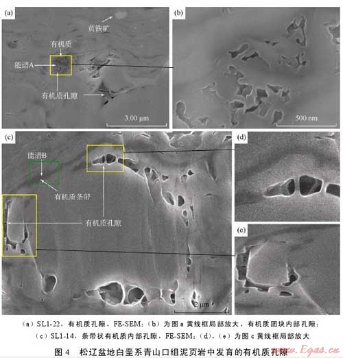 有機質(zhì)孔隙主要指有機質(zhì)團塊內(nèi)部或有機質(zhì)生烴后內(nèi)部殘留的孔隙。圖4為場發(fā)射掃描電鏡二次電子成像后觀察到的泥頁巖樣品中的有機質(zhì)孔隙,圖4a為有機質(zhì)團塊中的孔隙(圖4a中黃線標(biāo)出的黑灰色區(qū)域A區(qū)對應(yīng)的元素能譜見圖9a),孔徑為10~1500nmz已經(jīng)向烴類轉(zhuǎn)化,伴隨這一地質(zhì)過程,泥頁巖中產(chǎn)生大量有機質(zhì)生烴后的殘留孔隙,若泥頁巖處于高—過成熟階段,有機質(zhì)生烴后的殘留孔隙數(shù)量會大幅增加,其孔徑也會變大。