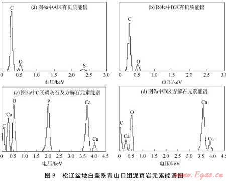 溶蝕孔隙主要是泥頁巖中方解石、磷灰石等碳酸鹽、磷酸鹽或硅鋁酸鹽在溶蝕作用下(主要是由于頁巖生烴過程中生成的有機酸或CO2溶于水形成碳酸,產(chǎn)生溶解作用)產(chǎn)生的孔隙。圖5為場發(fā)射電鏡和掃描電鏡下觀察到的礦物溶蝕孔隙。由圖5a可見磷灰石、方解石溶蝕后產(chǎn)生的大量溶蝕孔隙。圖5a中黃線標(biāo)出的黑灰色區(qū)域C區(qū)對應(yīng)的元素能譜見圖9c,區(qū)域內(nèi)鈣、氧、磷、碳元素含量較高,據(jù)此判斷溶蝕孔隙是磷灰石、方解石礦物溶蝕后產(chǎn)生,孔徑為10~500nm。由圖5b可見充填于溶蝕孔隙中的柱狀石膏和粒狀黃鐵礦,孔徑為100~2500nm。