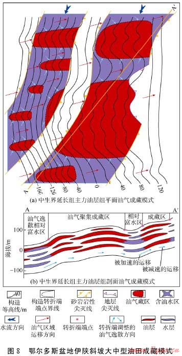 低幅度構造的發(fā)育為伊陜斜坡上油氣的逸散或富集提供了必要條件。低幅度構造局部產(chǎn)狀的陡緩變化影響運移通道中油氣沿斜坡上傾方向的運移動力、運移速度及運移方向,從而導致油氣運移途中發(fā)生局部或較大區(qū)域的逸散或富集,控制油氣水在空間上的分異與分布,形成相對的油氣富集區(qū)及含水較高的含油水區(qū),通常前者發(fā)育于低幅度構造的高部位,后者則處于諸如鼻凹等低幅度構造的較低部位或較大規(guī)模鼻褶群帶間的低洼分隔區(qū)。低幅度構造坡折帶轉折端端點連線與沉積相帶邊側部的巖性/物性尖滅線及局部的地層尖滅線等界線組合可形成巖性-構造、構造-巖性、地層-構造等復合圈閉以及較大的圈閉空間,有效地阻滯、封堵油氣運移,并截留、捕獲過路油氣,進而聚集形成油氣藏。繼承性發(fā)育的低幅度構造與多期次沉積的儲集層疊合,促成了垂向上多層系油(氣)藏的復合發(fā)育。低幅度構造與大型沉積體系及其有利相帶等條件組成優(yōu)勢配置,控制了伊陜斜坡內(nèi)中生界乃至古生界主要的油氣分布,奠定了盆地大面積成藏及大中型油氣田發(fā)育的地質基礎。