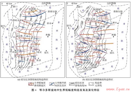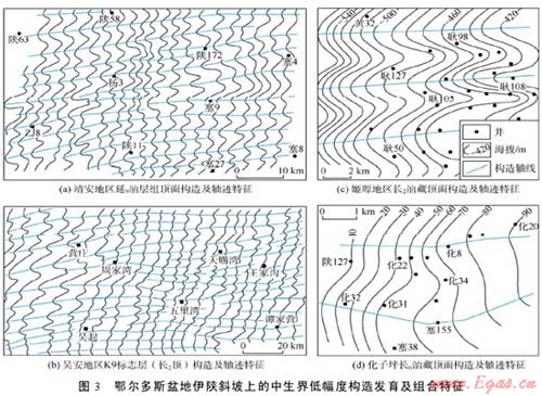 低幅度構造是低滲透—超低滲透致密砂巖非常規(guī)油氣藏的主要控制因素之一。鄂爾多斯盆地伊陜斜坡上的低幅度構造具有區(qū)域性、規(guī)模化發(fā)育,定向性延伸,排列式褶合,繼承性演化等特點,從而為盆地內(nèi)部中生界大中型油田的發(fā)育準備了配套條件。