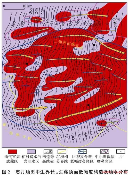 通常情況下,低幅度構造高部位及其組合而成的更大規(guī)模的鼻狀褶皺帶或者大型的低幅度隆起發(fā)育區(qū)必然成為油氣運移的主要指向區(qū)和油氣富集成藏的主要場所,而較低的鼻凹部位或較大規(guī)模鼻褶群帶間的低洼分隔區(qū)域則隨著油氣的相對逸散而成為含水飽和度較高的含油水區(qū)或天然的泄水區(qū)(見圖8)。在大中型復合低幅度構造中,局部鼻凹的負向屬性通常會被顯著弱化,因而可以成為有效的油氣捕集單元。陜北腹地的志丹油田即是一個受基底控制、由復合型鼻褶構造組合而成的大型低幅度隆起發(fā)育區(qū),油田總面積約3500km2,其中油氣的富集成藏區(qū)域與低幅度構造發(fā)育情況及沉積相帶展布密切相關,而含油水區(qū)則主要分布于局部的構造低洼分隔區(qū)以及沉積相帶的邊側部(見圖2)。