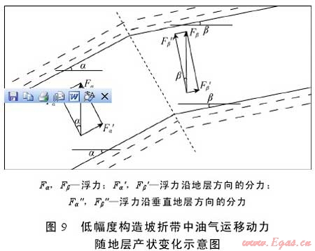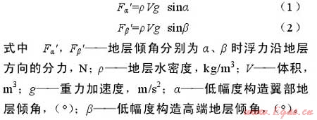 低幅度構造為油氣的逸散或富集提供了必要條件。伊陜斜坡整體為平緩的西傾單斜,地層傾角約1°,但大單斜的內(nèi)部發(fā)育大量各種類型的低幅度構造,鼻狀構造是其基本的構成單元,其斷面形態(tài)呈現(xiàn)出連續(xù)和反復的具一定起伏的坡折特性。在鼻狀構造的翼部,地層變陡,傾角比正常情況下增大3°~5°甚至更大;在鼻狀構造的高端部位或低洼處,地層轉趨平緩,傾角比正常情況減小1°~2°甚至更大角度(見圖8)。根據(jù)油氣運移理論,在水條件下,浮力是油氣二次運移最主要的動力[27]。對于鄂爾多斯盆地中生界特低滲—超低滲致密砂巖儲集層而言,浮力對油氣二次運移更為關鍵,其他動力如水動力等作用極小。如果地層傾斜且其上為蓋層所封閉,當油氣上浮到儲集層頂面時,在浮力作用下油氣必沿其上傾方向繼續(xù)運移;浮力沿地層方向分力的大小不僅與地層水密度有關,還與地層的傾角有關[27]。如果低幅度構造翼部地層傾角為α,至構造高端轉變?yōu)?beta;(見圖9),則油氣的上浮分力會相應地增大或減?。ㄈ绻剑?/span>1)、(2)所示)。因此,低幅度構造坡折帶地層產(chǎn)狀的陡緩變化影響運移通道中油氣沿斜坡上傾方向的運移動力、速度及方向等,使得油氣在局部區(qū)間或減速滯留聚集成藏或加速擴散。