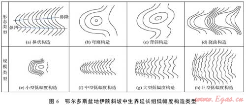 摘 要:根據(jù)大量鉆井及試采資料,結合地質及構造演化特征,采用密井網(wǎng)大比例尺繪圖方法研究鄂爾多斯盆地伊陜斜坡上的低幅度構造發(fā)育與油氣富集特征。低幅度構造具有區(qū)域性、規(guī)?;l(fā)育,定向性延伸,排列式褶合,繼承性演化等特點;依據(jù)構造形態(tài)、組合規(guī)模、成因機理等對低幅度構造進行初步分類,低幅度構造以應力成因為主,鼻狀構造為其基本的構成單元,構造軸跡呈近東西向。低幅度構造轉折部位地層產(chǎn)狀的陡緩變化影響油氣沿斜坡上傾方向的運移動力、速度及運移方向,造成油氣水的區(qū)間分異和油氣在局部空間上的逸散或聚集,形成相間分布的油氣相對富集區(qū)及相對富水的含油水區(qū);低幅度構造轉折端端點連線與沉積相帶邊側部位的巖性/物性尖滅線及局部的地層尖滅線等界線組合形成巖性-構造、構造-巖性、地層-構造等復合圈閉類型,進而使油氣聚集成藏。低幅度構造與大型沉積體系及其有利相帶等條件的優(yōu)勢配置控制了伊陜斜坡內(nèi)中生界乃至古生界主要的油氣分布。