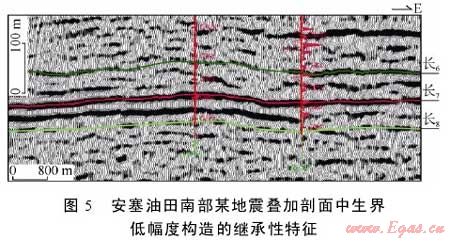 低幅度構造具有繼承性發(fā)育和演化的特點。圖3a、3b基本處于同一區(qū)域,延安組、延長組低幅度構造的平面組合基本一致,圖4a、4b也具有同樣的一致性特點,這充分反映鄂爾多斯盆地中生界延安組、延長組的低幅度構造是繼承性發(fā)育和演化的。圖5地震剖面清楚地顯示出某油田南部延長組上、下層序中起伏一致的低幅度構造特征,且構造高部位的鉆井中長6段的試采產(chǎn)量比構造低處鉆井的試采產(chǎn)量明顯偏高,這不僅從剖面組合上進一步印證了低幅度構造的繼承性發(fā)育特點,而且也證明了低幅度構造對油氣富集成藏具有重要的控制作用。此外,低幅度構造的發(fā)育也具有一定的演化差異,主要表現(xiàn)在地層自下而上,其中低幅度構造的定向性及構造幅度有所加強,閉合度增大,但復合規(guī)模則有所減小,圖3c、3d中長6和長2油層組的頂面構造特征及其差異能夠充分說明這一點。