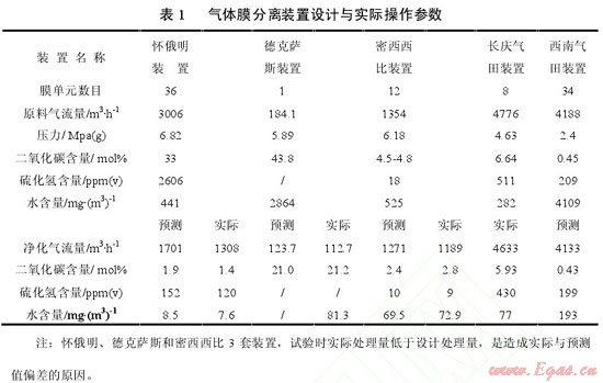 實(shí)際上從 20 世紀(jì) 80 年代以來,國內(nèi)外許多公司把膜分離技術(shù)應(yīng)用于天然氣凈化領(lǐng)域,做了大量的試驗(yàn)工作。表 1 是國內(nèi)外 5 套氣體膜分離裝置的設(shè)計(jì)與實(shí)際操作參數(shù),其中:懷俄明、德克薩斯和密西西比等 3 套裝置,采用美國格雷斯(GRECE)膜系統(tǒng)公司直徑為203.2mm的膜分離器[1];長慶氣田裝置,采用中科院大連化學(xué)物理研究所直徑為 200mm 的膜分離器,在原料氣處理量 12×104m3/d、壓力 5.4Mpa、溫度633℃條件下,經(jīng)膜系統(tǒng)凈化處理后,凈化氣壓力在 4.6Mpa時的水露點(diǎn)達(dá)到-13℃,甲烷回收率≥98%[2] ;西南油氣田裝置,由大連歐科膜技術(shù)工程有限公司負(fù)責(zé)成套,采用德國原裝進(jìn)口直徑為 150mm 的膜分離器[3],設(shè)計(jì)原料氣處理量10×104m3/d、壓力2.4Mpa、溫度 50℃條件下,天然氣脫水率>85% 、甲烷損失率 <1% 、水露點(diǎn):冬季<0 、夏季<10