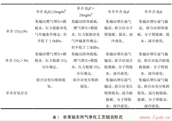 針對非常規(guī)天然氣單井氣質(zhì)條件不同,可以選擇不同的處理工藝。主要分為凈化氣管道外輸和凈化氣液化運(yùn)輸兩種類型,根據(jù)氣質(zhì)條件的不同,選擇不同的脫硫、脫水具體工藝如 2 所示。