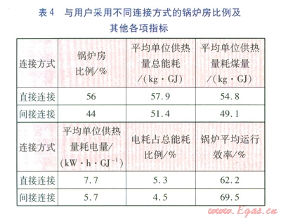 現(xiàn)場(chǎng)調(diào)查時(shí)發(fā)現(xiàn):當(dāng)鍋爐房與熱用戶采用直接連接方式時(shí),平均單位供熱量耗電量較高,主要原因是動(dòng)力設(shè)備耗電量較大。當(dāng)采用間接連接方式時(shí),平均單位供熱量耗電量較低,主要原因是動(dòng)力設(shè)備耗電量較少。與用戶采用不同連接方式的鍋爐房比例及其他各項(xiàng)指標(biāo)見(jiàn)表4。