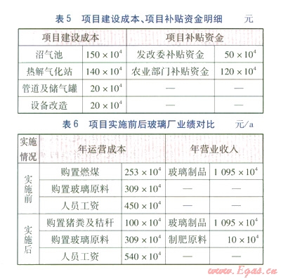 根據(jù)項目改造需要,在玻璃廠原有生產(chǎn)設(shè)備基礎(chǔ)上,需要修建沼氣池、熱解氣化站、儲氣罐等設(shè)施,應(yīng)列入建設(shè)成本。由于該項目符合國家政策中著力進行綠色能源縣以及新農(nóng)村建設(shè)的思路,可得到發(fā)改委以及農(nóng)業(yè)部門的財政補貼。結(jié)合企業(yè)自籌資金,項目改造具有充分的經(jīng)濟保證。項目建設(shè)成本、項目補貼資金明細見表5,項目實施前后玻璃廠業(yè)績對比見表6。項目實施前的人員數(shù)量為100人,實施后新增崗位30個。
