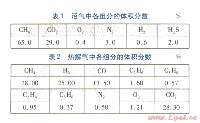 沼氣、熱解氣中各組分的體積分數(shù)見表1、2。熔化單位質(zhì)量玻璃耗熱量為2 000 MJ/t,玻璃廠每日熔化玻璃質(zhì)量約20 t/d。沼氣與熱解氣按l:1的體積比例混合,混合氣低熱值為l5 MJ/m3,燃氣玻璃池窯生產(chǎn)系統(tǒng)的熱效率取80%。由此可計算得每日混合氣需求量為3 333 m3/d,則沼氣與熱解氣的需求量分別為1 666.5 m3/d。經(jīng)核算,每日需處理豬糞35 t/d,需處理秸稈5.2 t/d。