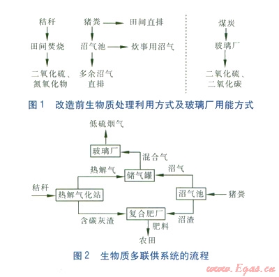 湘潭縣某玻璃廠生產(chǎn)能耗巨大,燃煤成本占年運營成本的25%,生產(chǎn)過程中排放大量S02、C02。經(jīng)調(diào)研發(fā)現(xiàn),湘潭縣被譽為“全國養(yǎng)豬第一縣”,該玻璃廠所在村莊建有130多口沼氣池,主要以當(dāng)?shù)氐呢i糞為原料,產(chǎn)生的沼氣除部分用于炊事外,其他均排至大氣。另外,由于豬糞產(chǎn)量巨大,在滿足沼氣池使用之外仍有過剩豬糞直排田間,在開放環(huán)境下產(chǎn)生甲烷、二氧化碳等。據(jù)初步估算,外排沼氣和過剩豬糞每年向環(huán)境排放的溫室氣體折合成二氧化碳約2 800 t/a。當(dāng)?shù)赜袊壹壋壦敬笠?guī)模推廣基地,目前村民大多采用田間焚燒的方法處理秸稈,大量生物質(zhì)能被浪費,排放大量二氧化硫及氮氧化物。