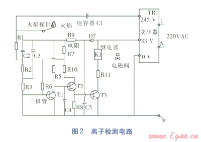 離子檢測(cè)是利用火焰燃燒時(shí)產(chǎn)生的外層離子導(dǎo)電原理,外層離子導(dǎo)通電子電路的放大元器件,從而判定火焰狀態(tài)。利用離子檢測(cè)的電路很多,現(xiàn)介紹以下電路作為參考,見圖2。
