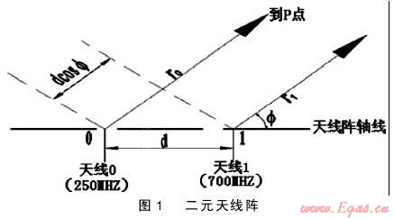 圖1為一個二元天線陣的示意圖,天線0同天線1均為偶極子天線,只是天線0為250MHz,天線1為700MHz。它們的取向(排列方向相同),兩天線間的距離為d,它們到觀察點p的距離分別為r0和r1,由于觀察點很遠,r0和r1可看成平行。在計算兩天線到p點的相位差時,可近似令r0≈r1,但計算兩天線到P點的相位時,應(yīng)采用較為準確的關(guān)系式r1=r0-dcosφ,當兩天線電流大小和相位關(guān)系為I1=mI0e-ja時(m與a為常數(shù)),天線1的輻射波在到達p點時將較天線0的輻射波超前相位φ=kdcosφ-a,等式右邊第一項是由兩天線的相對位置引起的;第二項是由兩天線電流的相對相位引起的。φ是天線陣由天線0到天線1(由電流超前引向電流滯后)的軸線沿著逆時針方向旋轉(zhuǎn)到指向觀察點的射線夾角。如果天線0在p點產(chǎn)生的場強是E0,則由于電場強度正比于電流的一次方,故天線1在p點產(chǎn)生的場強應(yīng)為E1=mE0ejφ,于是合成場強是E=E0+E1=E0(1+mjφ)可以看到,合成電場是由兩部分相乘求得的,第一個因子E0是天線0單獨產(chǎn)生于p點的場強,由天線0的類型(更確切的就是它的電流分布)決定;第二個因子(1+mejφ)只依兩天線之間電流比值和它們相互位置而定,與天線類型無關(guān),這一因子稱為陣因子。因此,由相同兩天線構(gòu)成的天線陣,它的合成方向圖是單獨一付天線的方向圖乘上因子。