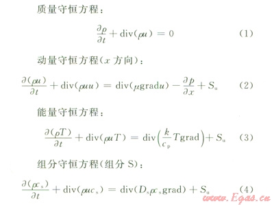 CFD可以看作是在流動(dòng)基本方程(質(zhì)量守恒方程、動(dòng)量守恒方程、能量守恒方程)控制下對(duì)流動(dòng)數(shù)值的模擬。通過這種數(shù)值模擬,可以得到極其復(fù)雜問題的流場(chǎng)內(nèi)各個(gè)位置上基本物理量(如速度、壓力、溫度、濃度等)的分布,以及這些物理量隨時(shí)間的變化情況。由于含硫天然氣是混合物質(zhì),因此,控制方程還應(yīng)包括組分守恒方程。4個(gè)方程的表達(dá)式如下。