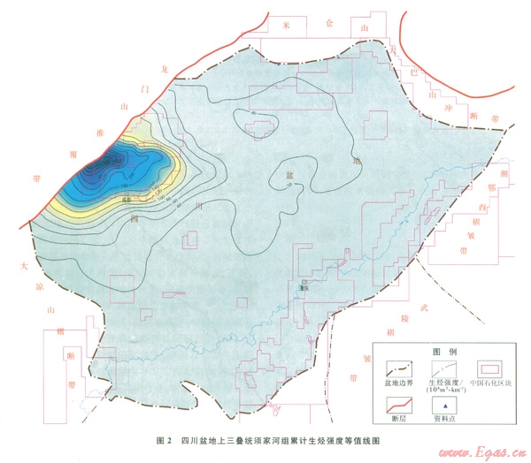 須家河組暗色泥質(zhì)烴源巖主要發(fā)育于須一段、須三段、須五段,生烴中心在川西坳陷中段(2),其生烴強度最大,為100×108300×lO8 m3km2