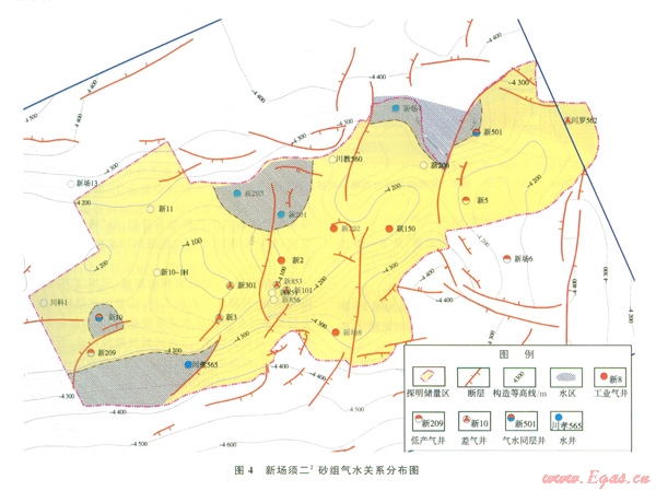 4顯示,新場氣田須二2砂組在氣藏較高部位還存在局部水區(qū),在南北均存在邊水且各井區(qū)氣水界面不同,這些現(xiàn)象充分說明氣藏沒有統(tǒng)一的氣水關(guān)系。