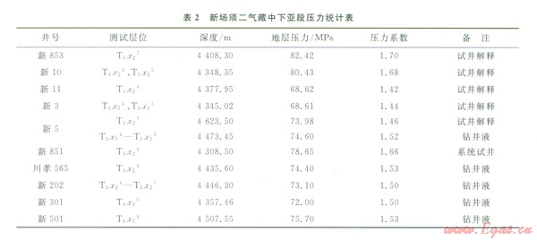 新場氣田須二段氣藏中下亞段共有11個測試數(shù)據(jù),計算的地層壓力如表2所示。從表2中可以看出,壓力系數(shù)在1.421.70之間一個較大范圍內(nèi)變化,總體表現(xiàn)出不同目標(biāo)區(qū)(或裂縫體系)壓力系數(shù)不同,如中部裂縫體系壓力系數(shù)高(851井須二4亞段壓力系數(shù)l.66,新853井壓力系數(shù)1.70),而該裂縫體系以西地區(qū)壓力系數(shù)大幅度降低(3井壓力系數(shù)1.44、新301井壓力系數(shù)1.50),氣藏東部裂縫體系壓力系數(shù)較低(5井壓力系數(shù)1.52,新501井壓力系數(shù)1.53),充分說明氣藏?zé)o統(tǒng)一的壓力系統(tǒng)。