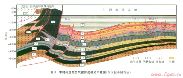 從圖5中可見:在前陸沖斷帶附近和高陡背斜帶,主要為成藏模式1。成藏特征:緊鄰生烴中心(生氣強度介于200×108300×108 m3km2);具繼承性背斜圈閉;斷層與裂縫發(fā)育,有利于油氣運移;河道砂體發(fā)育;含煤泥頁巖為蓋層。②氣藏類型:受斷層控制的構(gòu)造氣藏。壓力系數(shù)為l.1,地溫梯度介于2.182.25℃l00 m,屬常溫常壓深層氣藏。主控因素:斷裂活動與性質(zhì)、保存條件是天然氣富集主控因素。大邑須二段須三段氣藏、洛帶須家河組氣藏、建南須六段氣藏即屬此模式。