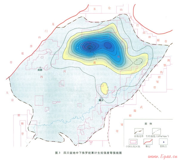 侏羅系烴源巖主要發(fā)育于下侏羅統(tǒng)自流井組和中侏羅統(tǒng)千佛崖組,生烴中心位于川北和川東北(3),生烴強度為30×l08100×108 m3km2。