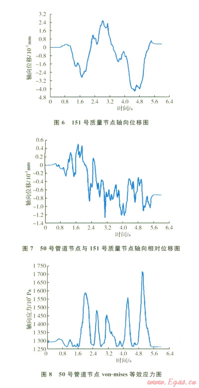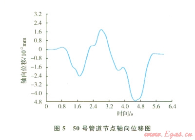圖8顯示了管道50號(hào)節(jié)點(diǎn)von-mises等效應(yīng)力在整個(gè)爆破地震波作用周期內(nèi)的變化趨勢(shì),在第4.8 s時(shí)管道中間節(jié)點(diǎn)應(yīng)力達(dá)到170 MPa,仍然處于彈性階段。由于描述地震破壞作用的主要參數(shù)是軸向應(yīng)變,而此算例的軸向應(yīng)變最大值為0.0011,與采用抗震規(guī)范法中計(jì)算出的最大軸向應(yīng)變?yōu)?span lang="EN-US">0.001 3極為接近,也證明了模擬結(jié)果的準(zhǔn)確性。