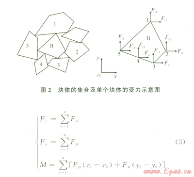 式中Fx、Fy分別為xy方向上的合力;M為合力矩。其中(x0y0)為塊體B質(zhì)心坐標(biāo),力矩以逆時(shí)針方向?yàn)檎?。對公?span lang="EN-US">(3)求導(dǎo)可以得出塊體質(zhì)心的運(yùn)動(dòng)方程,對質(zhì)心的運(yùn)動(dòng)方程進(jìn)行向前差分格式數(shù)值積分可以得到巖塊質(zhì)心沿xy方向的速度和位移。
