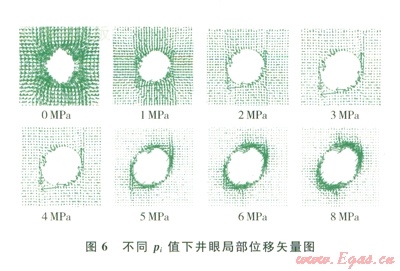 2.3.2模型微觀變化顯示隨著pi值增大,井壁附近最大位移逐漸減小