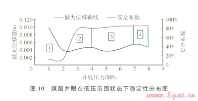 從圖l0上看,安全系數(shù)越高,而最大位移量越小,即兩者重合區(qū)域最大范圍即為最佳穩(wěn)定區(qū)間,故將煤層在低壓范圍內(nèi)井壁穩(wěn)定性分為4個(gè)部分,其中1區(qū)間由于位移量最大,安全系數(shù)最低,故該煤層在該區(qū)間的井內(nèi)壓力下,井壁極其不穩(wěn)定;在區(qū)間2、區(qū)間4位移曲線和安全系數(shù)圍成區(qū)間幾乎相當(dāng),可以預(yù)見這兩個(gè)壓力區(qū)間內(nèi)井壁穩(wěn)定性等級相當(dāng);區(qū)間3最大位移量在整個(gè)模擬過程中趨于最小范圍,而安全系數(shù)保持在較高水平,故該區(qū)間內(nèi)煤層穩(wěn)定性系數(shù)最高。所以,當(dāng)井底壓力在47 MPa區(qū)間時(shí),煤層井壁在該煤層參數(shù)下最佳穩(wěn)定。