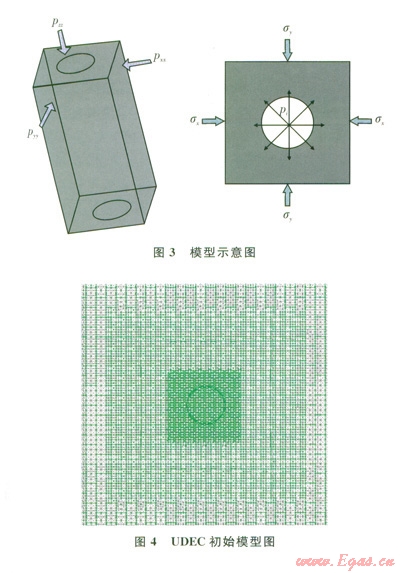 選取3號煤所處地層進(jìn)行分析。假設(shè)據(jù)地面深度為700 m,設(shè)邊長為2 m的正方形作為研究對象,井眼尺寸為øl52.4 mm。為盡量研究關(guān)心區(qū)域,在建模過程中,井眼附近區(qū)域內(nèi)單元尺寸按真實(shí)節(jié)理大小設(shè)計(jì),其他區(qū)域采用雙倍節(jié)理間距設(shè)計(jì)。模型主要受應(yīng)力邊界條件σx、σy、σz,位移邊界x、yz以及井眼有效壓力pi約束(3、4)(之所以用有效壓力pi,是為了簡化分析因素,將各種井底因素簡化為力學(xué)因素,不考慮滲流)。