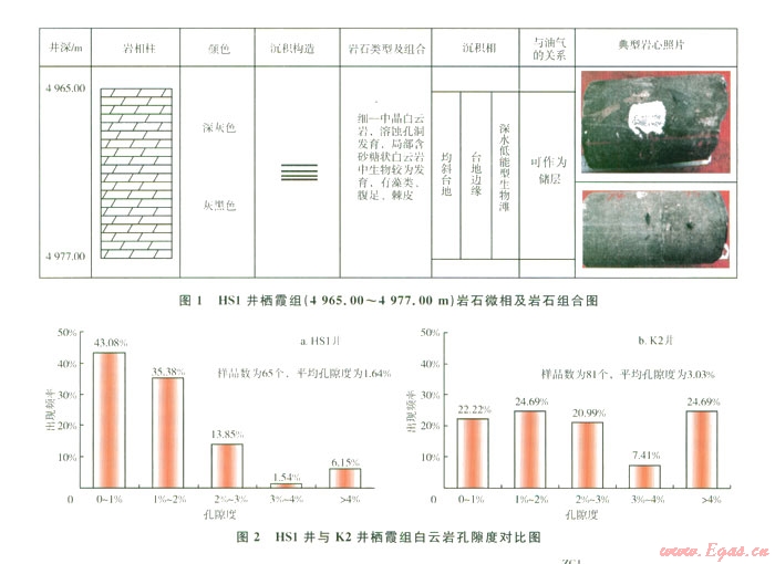 測(cè)井電性特征是巖石本身以及巖石內(nèi)部流體等綜合反映的結(jié)果,這也是進(jìn)行測(cè)井解釋儲(chǔ)層及其含流體情況的基礎(chǔ)。儲(chǔ)層的儲(chǔ)集性能主要受沉積環(huán)境、成巖作用的影響。依據(jù)前人的研究成果,結(jié)合野外地質(zhì)觀察發(fā)現(xiàn),川西地區(qū)棲霞組儲(chǔ)層主要為生物灘,古生物化石從破碎到完整均有,不具抗浪格架,平面上由于位置不同,沉積環(huán)境的不同,其結(jié)構(gòu)組分和后期成巖作用也有著明顯的差異。根據(jù)川西地區(qū)棲霞組巖心觀察和野外露頭結(jié)果認(rèn)為,川西南部地區(qū)棲霞組巖性主要為水體能量較低的泥品灰?guī)r夾細(xì)-中晶白云巖化灰?guī)r。從巖心觀察看,HS1井棲霞組取心段巖性主要為深灰-灰黑色白云巖,局部發(fā)育中晶白云巖(1)。根據(jù)65個(gè)柄霞組巖心樣品物性分析表明,HS1井孔隙度分布范圍較大,介于0.1 6%~l0.39%,主要孔隙度集中在02%之間,平均孔隙度僅為l.64%,明顯低于川西北部地區(qū)K2井棲霞組巖心的平均孔隙度(3.03),滲透率極低,一般均小于0.008 mD(2)。儲(chǔ)層物性特征表明,川西南部地區(qū)棲霞組儲(chǔ)層具有低孔隙度、低滲透率致密碳酸鹽巖儲(chǔ)層的特征,雖然儲(chǔ)層中局部存在高孔隙度、高滲透率段,但總體看來(lái)儲(chǔ)層儲(chǔ)集性能差,根據(jù)四川盆地碳酸鹽巖儲(chǔ)層劃分標(biāo)準(zhǔn)來(lái)看應(yīng)屬于差儲(chǔ)層-非儲(chǔ)層。