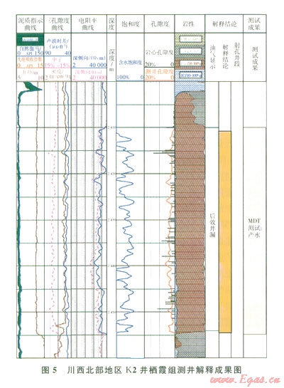 當(dāng)儲(chǔ)層內(nèi)的流體為低礦化度的地層水或淡水時(shí),由于水中呵移動(dòng)的導(dǎo)電離子數(shù)大量減少,從而導(dǎo)致電阻率值增加,在測(cè)井電阻率曲線上則表現(xiàn)出高電阻率特征。由于隨著勘探程度的不斷提高,勘探家們?cè)絹?lái)越認(rèn)識(shí)到淡水地層的電阻率類同氣層,電阻率值較高,因而按常規(guī)解釋易出偏差,這也是HS1井柄霞組水層呈現(xiàn)出高電阻率特征易解釋失誤的原因。K2井棲霞組巖性主要為淺灰-灰色細(xì)-中晶白云巖,粗晶(砂糖狀)白云巖發(fā)育。巖心分析物性表明,孔隙度分布范圍介于0.42%~l 6.61%,孔隙度在各個(gè)區(qū)間分布較為平均,平均孔隙度為3.03%,明顯較HS1井高(2),儲(chǔ)層物性特征明顯較致密的HS1井好,屬于中等-好儲(chǔ)層。從K2井儲(chǔ)層測(cè)井解釋看,棲霞組儲(chǔ)層電性特征具有低伽馬值、高電阻率、相對(duì)較高的聲波時(shí)差特征,無(wú)疑具有典型的氣層特征(5)。但通過該井MDT取樣分析卻表明:儲(chǔ)層段產(chǎn)水。根據(jù)本井MDT水樣分析資料,其Cl-含量?jī)H164 mgL礦化度低,反映儲(chǔ)層中的水為淡水特征。