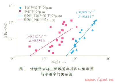 喉道大小及分布是控制儲層滲流能力的關(guān)鍵。定義對滲透率累積貢獻(xiàn)達(dá)95%以前喉道半徑的加權(quán)平均值為主流喉道半徑。須家河組不同儲層巖樣主流喉道半徑和中值半徑與滲透率關(guān)系表明(圖1),主流喉道半徑隨滲透率的增加而增加,二者之間存在非常好的正相關(guān)關(guān)系;但是中值半徑與滲透率之間的相關(guān)性較差。這說明主流喉道半徑不僅能表征儲層基質(zhì)的滲透能力,而且能夠反映儲層微觀孔隙結(jié)構(gòu)特征。