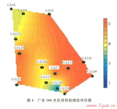 應(yīng)用儲層評價方法對廣安2井區(qū)須六段儲層和廣安106井區(qū)須四段儲層進(jìn)行了分類評價(圖3、4)。從圖中可以看出,廣安2井區(qū)須六段儲層中部南北向儲層為Ⅰ、Ⅱ類儲層;向東、西兩翼發(fā)展儲層逐漸變差,為Ⅲ、Ⅳ類儲層。因而,中部南北向為氣藏富集區(qū),是氣藏開發(fā)的重點區(qū)域。廣安106井區(qū)須四段儲層整體為Ⅲ、Ⅳ類儲層,西北翼和南部儲層相對較好。