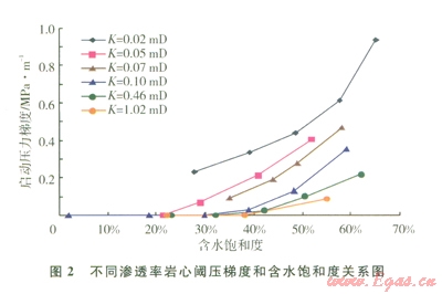 低滲透砂巖含水氣藏巖樣滲流實驗表明,當(dāng)含水飽和度較高時,氣體滲流出現(xiàn)非達(dá)西流現(xiàn)象,存在閾壓梯度[8]。閾壓梯度與巖心滲透率及含水飽和度相關(guān)(圖2),巖心滲透率越低,含水飽和度越高,閾壓梯度越大。閾壓梯度可作為衡量儲層流動性強弱的指標(biāo),也是影響儲量動用程度的重要參數(shù),因此,將閾壓梯度作為低滲含水儲層評價參數(shù)是必要的。