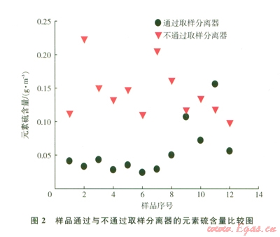 同時,為避免水和顆粒物等對井口取樣準(zhǔn)確性的影響,常規(guī)天然氣分析常會采用取樣分離器。但從試驗研究結(jié)果來看,樣品通過取樣分離器取樣測定的元素硫含量低于樣品不通過取樣分離器取樣測定的元素硫含量(圖2)。岡此,元素硫取樣方案中應(yīng)明確提出采用樣品不通過取樣分離器方式進行取樣,這是準(zhǔn)確測定元素硫含量的關(guān)鍵環(huán)節(jié)。
