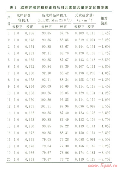 為了保證取樣時取樣容器中不含影響測定準(zhǔn)確性的水和氧氣等干擾物,在取樣前對容器進行干燥和無氧化處理是非常重要的。同時由于計算元素硫含量時,需要掌握樣品在標(biāo)準(zhǔn)參比條件(我國為101.325kPa,20.0℃)下的體積。而天然氣樣品是采集在壓力下的取樣容器中的,當(dāng)已知取樣容器的容積、樣品的壓力和氣體在壓力下的壓縮岡子,根據(jù)氣體狀態(tài)方程,可計算天然氣樣品在標(biāo)準(zhǔn)參比條件下的體積。因此,如何準(zhǔn)確測定取樣容器的容積是實施測定前必須考慮的關(guān)鍵因素之一。表l為取樣容器進行容積校正前后對元素硫測定結(jié)果的影響程度??梢钥闯觯尤萜魑葱U亓蚝恐当刃U亓蚝恐档?span lang="EN-US">2%~5%。