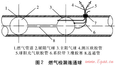 這種燃?xì)鈾z漏連通球工具,利用兩只相互連通的橡膠球,在管道內(nèi)制造一個(gè)局部密閉空間,用來檢漏。這是一組用橡膠管連接起來的可充氣的連體橡膠球膽,球膽充氣軟膠管是為主阻氣球、輔阻氣球充、泄氣用的專用管;測壓軟膠管穿過主阻氣球通至兩球間,它與主阻氣球密封連接,但不連通,不影響連通球本身的整體密閉性,它的作用一是為管道內(nèi)新制造的這個(gè)局部密閉空間充、泄氣,二是充氣后測壓;系拉帶是檢漏完畢后為取出連通球而專設(shè);橡皮塞起密封作用,與軟管和系拉帶之間用橡皮泥密封。