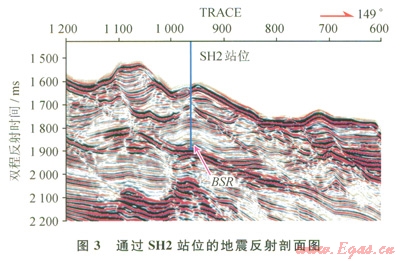 圖3是神狐海域過SH2站位的地震反射剖面,從圖3中可看出,沉積物波表現(xiàn)為席狀波狀相,整體呈長條形或伸長狀席狀外形,厚度較為均一,內(nèi)部同相軸呈不對稱波狀反射結(jié)構(gòu),向上坡方向遷移攀升;在橫切大陸坡的剖面上,呈連續(xù)的波狀或丘狀;其底部有明顯的滑脫面,這是由于底流發(fā)育時具有較強(qiáng)的侵蝕能力,對早期的沉積物進(jìn)行了簸選改造和再沉積,頻繁的侵蝕界面可能反映r底流的脈動性。剖面上TRACE900~TRACEl 000,BSR之上有一明顯的因速度振幅異常而形成的眼球狀結(jié)構(gòu),是一條比較典型的含水合物層特征的地震剖面。另外,BSR上面有明顯的、連續(xù)性較好的振幅空白帶,極性與海底極性相反。