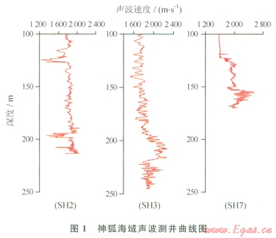 2007年,我國在神狐海域?qū)嵤┝怂衔镢@探,在SH3、SH2和SH7站位成功鉆獲水合物實物樣品,筆者利用這3個站位的聲波測井曲線來分析含水合物層的特征。