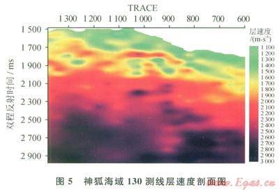 圖5為神狐海域l30測線用Dix公式計算的層速度剖面。在距海底大約250ms上方附近(地震剖面上解釋為BSR位置),明顯顯示出一段近似平行于海底的相對高速層,高速層上、下都是明顯的低速層。高速層的層速度在1800~2500m/s,其上面低速層的層涑度為1500~1700m/s,而下面的低速層的層速度在l100~l500m/s,有明顯的游離氣存在的低速特征,可以認(rèn)為該測線的相對高速層速度是水合物層的反映。