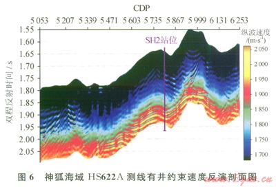 圖6是神狐海域HS622A測線速度反演剖面。距海底大約200ms的沉積層中有一與海底平行高速帶,厚度約為25m,速度值在2050m/s左右,是沉積層中有水合物存在的體現(xiàn)。高速之下有一速度值約為1800m/s的低速帶,是水合物層之下存在游離氣層的緣故。與層速度剖面相比,有井約束速度反演剖面具有更高的分辨率,能更準(zhǔn)確地判定水合物的富集層位,礦體厚度和游離氣的分布情況,對水合物的速度精細(xì)解釋起到關(guān)鍵的作用。