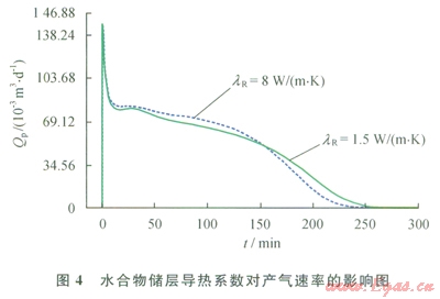 導(dǎo)熱系數(shù)是指水合物儲層傳播熱量的能力。水合物分解是一個吸熱過程,對于水合物地層,若其導(dǎo)熱系數(shù)大,則在單位時間多孔介質(zhì)中有更多的熱量傳遞到水合物分解前緣,對水合物分解有更好的促進(jìn)作用。圖4顯示了地層導(dǎo)熱系數(shù)(lR)分別為1.5 W/(m·K)和8W/(m·K)條件下水合物藏產(chǎn)氣速率隨時間變化的關(guān)系[28]??梢园l(fā)現(xiàn),在其他參數(shù)相同的條件下,在開采的前期,隨著地層導(dǎo)熱系數(shù)的增加,水合物產(chǎn)氣速率增加;開采后期隨著地層導(dǎo)熱系數(shù)的增加,水合物產(chǎn)氣速率反而減小,但導(dǎo)熱系數(shù)對水合物藏產(chǎn)氣速率的總體影響很小。