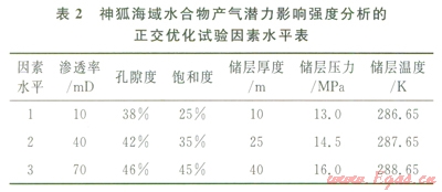 水合物藏產(chǎn)氣潛力的地質(zhì)評價參數(shù)是指對水合物產(chǎn)氣效率產(chǎn)生影響的沉積地質(zhì)要素,地質(zhì)評價參數(shù)的正確選擇是產(chǎn)氣潛力評價的關(guān)鍵。首先,通過綜合特定海域水合物區(qū)的地質(zhì)、地球物理、鉆探數(shù)據(jù)等資料,研究巖性、巖相展布規(guī)律、水合物的賦存狀態(tài)和地質(zhì)條件、水合物產(chǎn)m特征和儲層類型,定性和定量分析影響水合物分解和產(chǎn)氣潛力的各項要素,如巖性、溫壓條件、沉積體孔隙度、水合物飽和度、滲透率、儲層厚度、孔隙水鹽度等;然后,數(shù)值分析地質(zhì)參數(shù)對水合物產(chǎn)能的影響強度和敏感性,利用正交優(yōu)化試驗方法對地質(zhì)參數(shù)的影響強度進(jìn)行排序,如表l中南海北部神狐海域3個站位上的水合物產(chǎn)出特征的地質(zhì)參數(shù),可構(gòu)建如表2所示的正交優(yōu)化試驗因素水平表,通過選用合適的正交表即可實現(xiàn)對地質(zhì)參數(shù)的優(yōu)化和排序;選擇對水合物藏產(chǎn)氣潛力影響較為顯著的地質(zhì)參數(shù),舍棄影響較小、敏感性差的地質(zhì)參數(shù)。